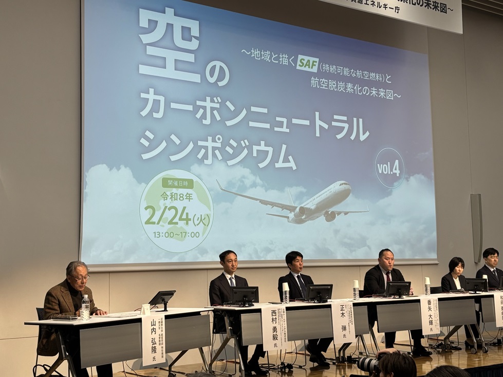 2026年2月24日「空のカーボンニュートラルシンポジウム」が、国土交通省と経済産業省資源エネルギー庁の主催で開催されました。SAF(持続可能な航空燃料)への理解促進や利用拡大に向けた取組の紹介イベントがありました。WOOMS統括リーダー正木は、パネリストとして「SAFの将来ビジョンと地域連携について」ディスカッションさせていただきました。
